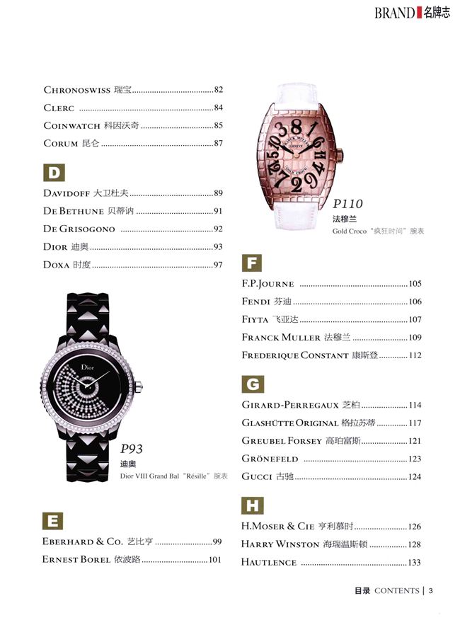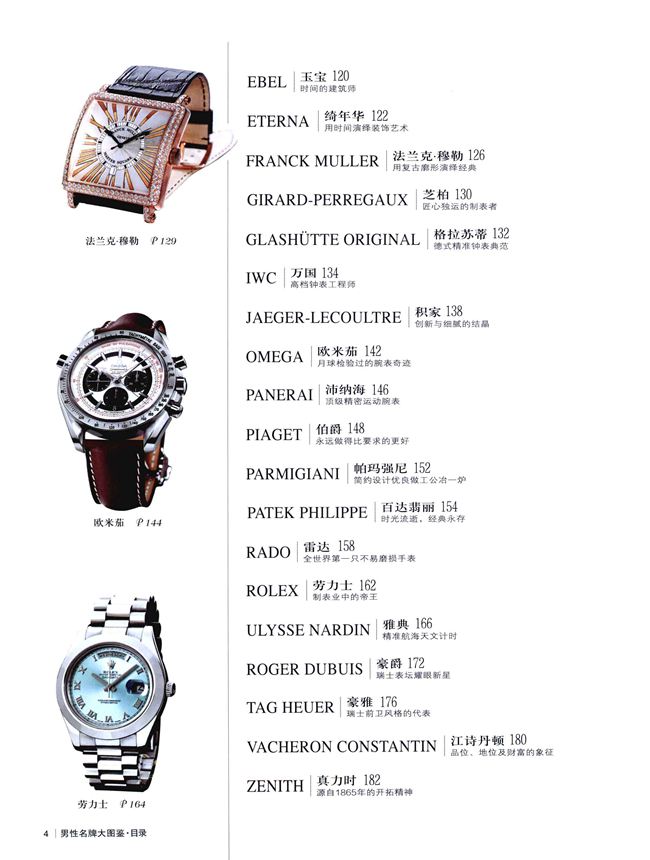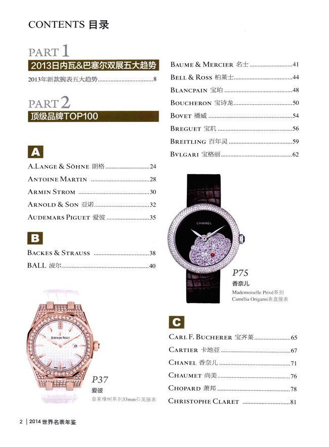 100个世界顶级品牌1700枚新款腕表全收录,全面展示各品牌最新、最具收藏价值的腕表款式,均标注综合世界各地价格之后的参考价。每款腕表都有详细的专业知识介绍,让读者在欣赏的同时,更进一步了解该腕表的具体参数和相关数据,方便读者更加理性的购买与投资。此外,本书还对每个品牌的历史等信息做了详尽的介绍,非常适合腕表爱好者、收藏者以及时尚人士阅读和收藏。
