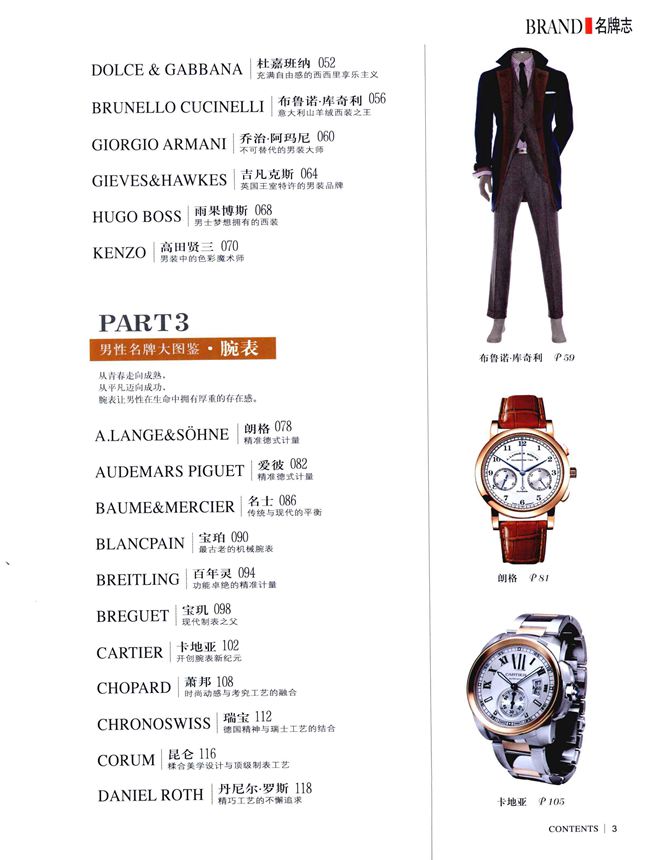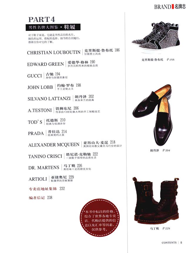 本书分为皮具、服装、腕表、鞋履4大部分,汇集国际著名60大男性奢侈品牌,是一本图片精美,内容丰富,价格详实,物超所值的精美图鉴。精美与实用并存,文字简练之余不失活泼,让读者在轻松阅读的同时,可以深度感受、体验品牌带来的经典传承与价值所在,具备收藏价值,让每位男士在欣赏各大经典奢侈产品的同时,快速找到适合自己的着装风格、佩戴需求,并为不太会搭配的男士提出实用的搭配建议。此外,读者还可通过扫货指南,前往离自己最近、最方便的品牌专柜,现场挑选、试穿。成为从头到脚都散发出非凡魅力的时尚绅士。